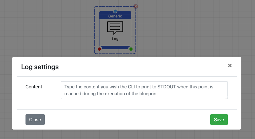 As explained earlier, most of the actions have settings that can be opened by either double clicking or right clicking on an action. Each action's settings are completely independent from other action's settings. Actions having settings means that they expect the user (you!) to provide additional data of some sort. For example, the "Log" action has a single text field called "Content". Any value inserted in that field will be printed to STDOUT by the CLI when the execution flow has reached that action.