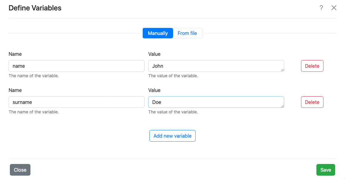 This is the default way. A Name and a Value are needed to define the variable. You can also click on the Add new variable button in order to add more than one variables.