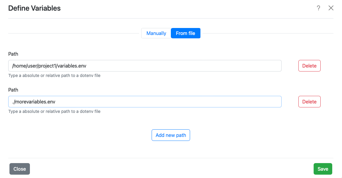 This is the alternative way to declare variables. A a dotenv file with the variables definition is required, for instance: